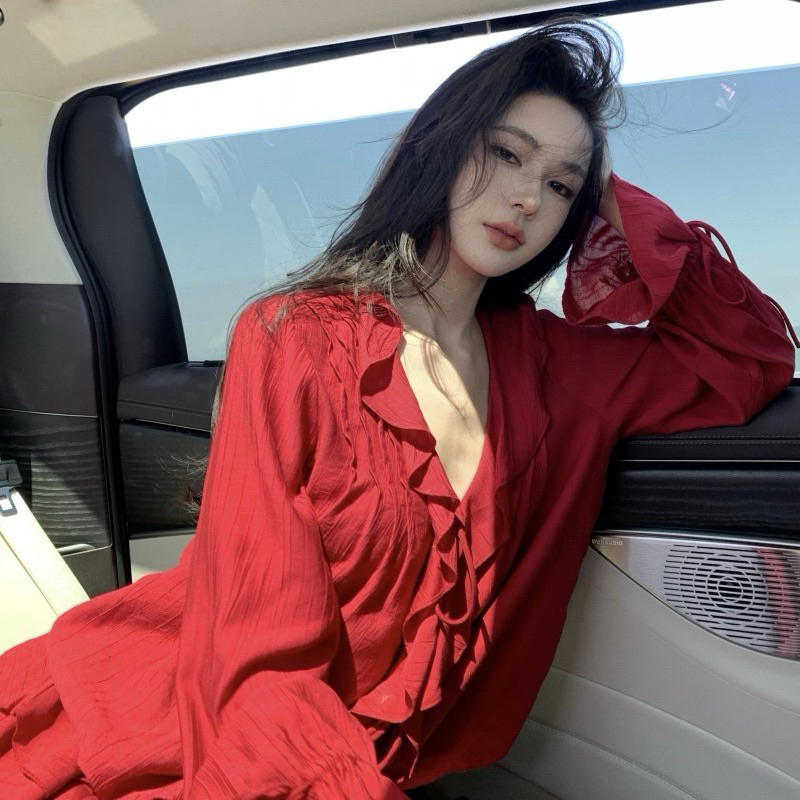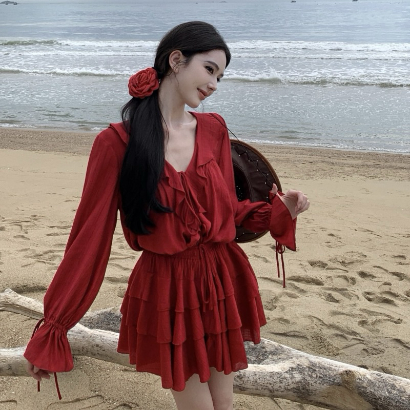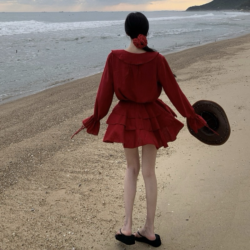 Set áo sơ mi tay phồng + chân váy đỏ vang trendy